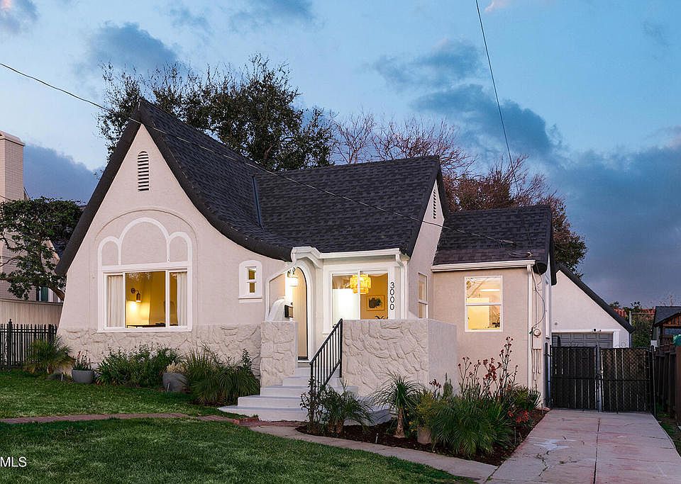 Delightful storybook English cottage offers endless charm and spacious backyard with mountain views.