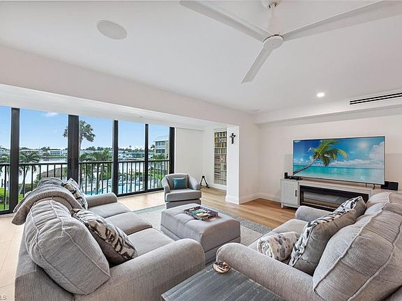 This updated third-floor, three-bedroom home offers stunning views of Moorings Bay. Conveniently located across from beach access, you can spend your days basking in the sunshine and end the day watching the colorful sunset. This newly remodeled unit features luxury vinyl plank flooring throughout, a smart home control panel, in-unit laundry, a west-facing open-aired private balcony off the primary bedroom with Gulf views and much more. Enjoy this bay-front residence featuring a wall of impact glass sliders designed to maximize the view. The kitchen is equipped with Lincoln quartz countertops and backsplash, a large island with bar seating that is perfect for entertaining guests, Bosch appliances and a wet bar complete with a wine cooler. Harbour Cove residents enjoy a peaceful bay-front pool, grills, and onsite boat slips that can be leased through the association. Owners can lease their units three times a year with a 60-day minimum. Located on Gulf Shore Boulevard, just north of Harbour Drive, it's a quick bike ride to the private Moorings Beach Park or the renowned shopping and dining at Venetian Village.