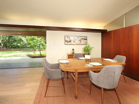 In 1950 award winning architect James Van Dyke designed this mid-century modern property as his personal residence. With both bold features and subtle detail, mid-century lovers will appreciate all the style this home has to offer. Modern updates blend seamlessly with the many original details and finishes that have been preserved and restored. One of the many highlights is the set of sliding glass doors in the living room that slide completely into the wall creating a 17-foot opening to theback yard, giving a true indoor/outdoor living experience. The living room also features a handsome stacked brick fireplace that spans the entire wall and spills over to the adjacent doorway and outside. The understated concrete-looking quartz countertops and stainless-steel sink make the striking backsplash and unique refinished original cabinets pop. The upstairs consists of one bedroom and a bathroom, perfect for a home office, guest area, or in-law quarters. The property has two separateback yard areas, one for the pool and outdoor kitchen and the other is a private yard area with a lawn, mature trees and patios. Other features include hardwood floors throughout, central heat and AC, oversized two-car garage, new paint inside and out, and a breakfast nook