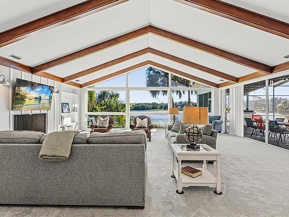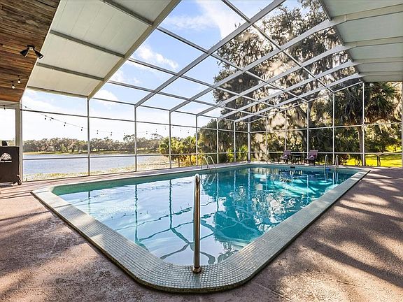 This timeless mid-century waterfront estate on 5.28 gated acres in Lady Lake blends vintage charm, modern comfort, and rare privacy. Spanning 3,294 sq ft, the 4-bed, 4.5-bath residence features one of the largest private waterfrontages on Lady Lake. The spacious primary suite opens to the screened pool and deck, while a private in-law suite and detached studio with a kitchenette, full bath, and lake views create ideal guest or multigenerational spaces. Enjoy resort-style living with a 44,000-gallon pool, fruit trees, a pole barn, and park-like grounds perfect for entertaining up to 250 guests. Recent upgrades include a new roof and HVAC (2023), full re-pipe, new well, water heaters, electrical, and septic updates (2025). Dock studs are ready for your future dock, ideal for boating or fishing. With no HOA and zoning that allows domestic and farm animals, this extraordinary Lady Lake estate offers an unmatched combination of tranquility, functionality, and timeless appeal.