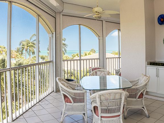Desirable SW facing, oversized corner residence with wrap around balcony,features sunny,Gulf, pool, sunset,Sand Dollar Island, Keewayden Island and Marco River views ! 2 BEDROOM +DEN/3 BATH (2443 A/C)(3050 Total).Expansive screened wrap around balcony opens to living areas and primary bedroom/den.Electronic storm shutters for easy enclosure.Spacious Heritage model. Meticulously maintained,pristine white tiling with newly installed carpet in bedrooms and den. Newer stainless appliances , kitchen opens to breakfast nook and outdoor dining option with views of Collier Bay. French doors enclose a spacious den, ideal as a guest suite with an ensuite bath and adjacent closet. Assigned upper level parking spot, adjacent to elevator and stairs for easy condo access.Easy beach and pool access. Community golf cart access. . Full amenity ,gated private beachfront community, features community pool, several dining options, fitness center, tennis, golf, pickelball Come and enjoy the Hideaway Beach lifestyle! furnished per inventory.