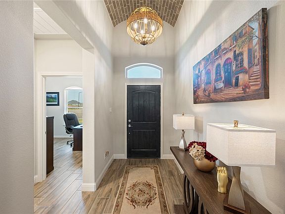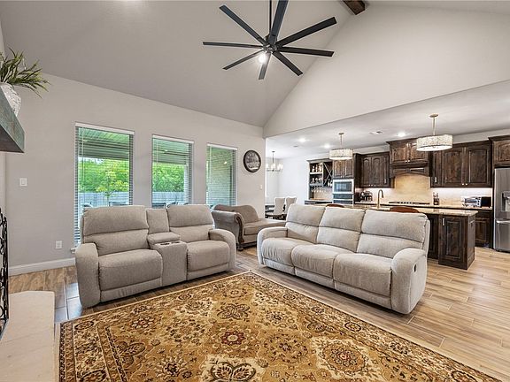 Less than 2 years old this custom built home offers a fantastic floor plan with great amenities! The light and bright, split bedroom, open concept plan offers four bedrooms, three full baths, a spacious family room with a cathedral ceiling and an eat-in island kitchen with a large dining area. The family room, dining room and kitchen are all open to each other, perfect for entertaining and everyday living. The gourmet kitchen offers beautiful granite counters, and stainless steel appliances including a 5-burner gas cook top, built-in electric oven, built-in dishwasher and microwave. Extensive custom cabinets including a fantastic built-in wine bar and a large pantry. The primary retreat offers a spacious bedroom and a spa like bathroom with a walk-in tile shower, separate garden tub, granite vanity and a huge walk-in closet. The in-house utility room offers extra storage cabinets and a large mud area just off of the garage offers even more storage. The other three bedrooms are spacious with large closets. Two full beautifully appointed baths with tile surround tub/showers are convenient to the bedrooms. A large, covered patio overlooks the private fully fenced back yard. Wood tone tile floors are throughout all of the living areas and two bedrooms, tile floors in all of the bathrooms and kitchen, carpet in primary and two of the bedrooms. Abundant custom fixtures and features make this home a fantastic value!