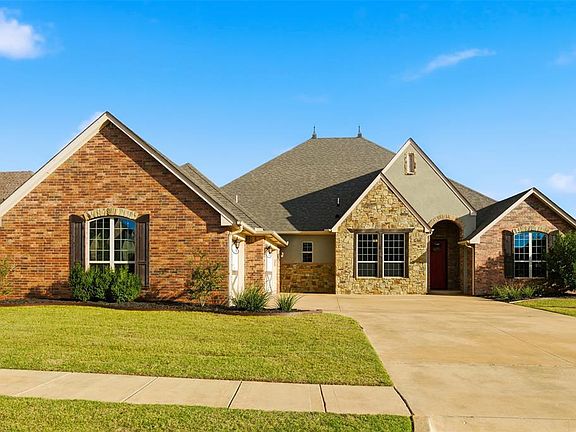 Experience luxury, comfort, and thoughtful design in this energy-efficient home located in the highly sought-after Thornbrooke addition in Edmond schools. Boasting four bedrooms, 3.5 baths, a bonus room, a dedicated study that could serve as a fifth bedroom, and two master suites, this home is perfect for multigenerational living or flexible family needs. Step inside to a chef-inspired kitchen featuring two 9-foot islands, granite countertops, built-in double ovens, stainless steel appliances, crown molding, and an 8-foot walk-in pantry. The kitchen opens seamlessly to a spacious living area with rich wood floors and a floor-to-ceiling stone fireplace, creating a warm and inviting centerpiece for family gatherings. The home includes a bonus room with a wet bar/kitchenette, perfect as a second living area or entertainment space, and a movie room for the ultimate theater experience. Each bedroom features large walk-in closets and ceiling fans, while the Jack-and-Jill bathroom conveniently serves two of the guest bedrooms. The private second master suite boasts its own ensuite and a generous walk-in closet. Additional features include a dedicated study, mud bench, three-car garage, tankless water heater, sprinkler system, and a storm shelter, combining comfort, safety, and efficiency. The 31x15 covered rear patio provides the perfect space for outdoor entertaining or relaxing in privacy. With its thoughtful design, flexible living spaces, and proximity to highways, this home seamlessly blends style, functionality, and convenience — a true gem in Edmond’s Thornbrooke addition.