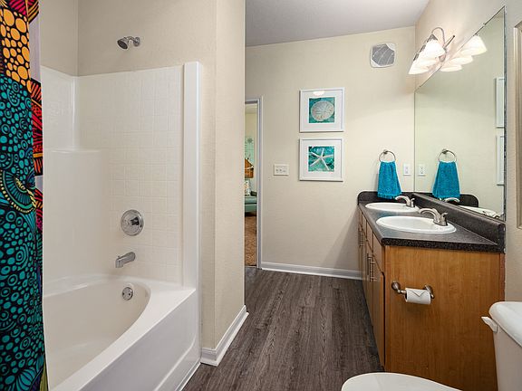 The Verde floor plan is our largest 2 bedroom 2 bathroom apartment home and it features plenty of windows to let the sunshine in. The living room is open to the kitchen for entertaining and the master suite has a spacious walk in closet and a double sink vanity in the bathroom.