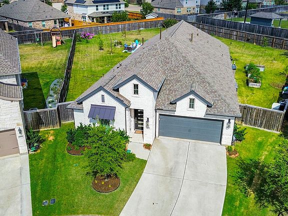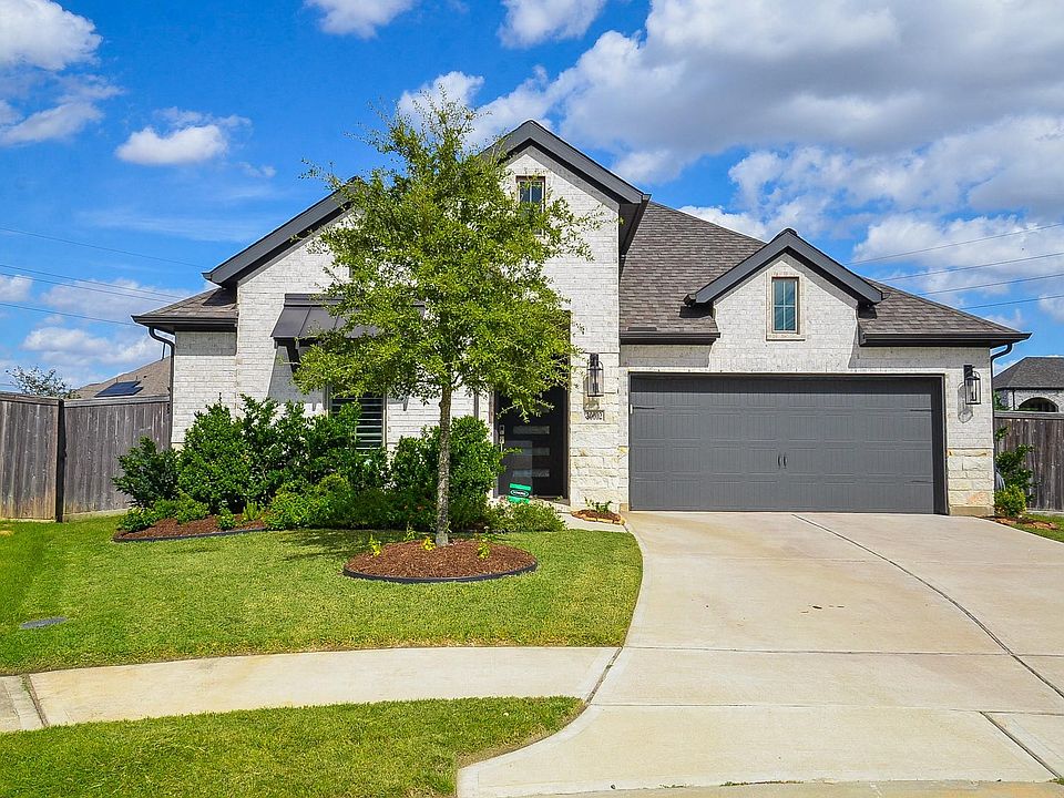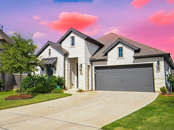 Step into elegance with soaring 13-foot ceilings and a welcoming game room framed by French doors. The extended entry flows seamlessly into the open kitchen and dining area, showcasing a stunning island with seating, corner pantry, and quartz countertops. A cozy family room with a wood mantel fireplace and wall of windows overlooks the backyard retreat. The secluded primary suite offers a spa-like bath with dual vanities, soaking tub, glass shower, and dual walk-in closets. A guest suite with full bath, two secondary bedrooms, and a mud room add convenience.