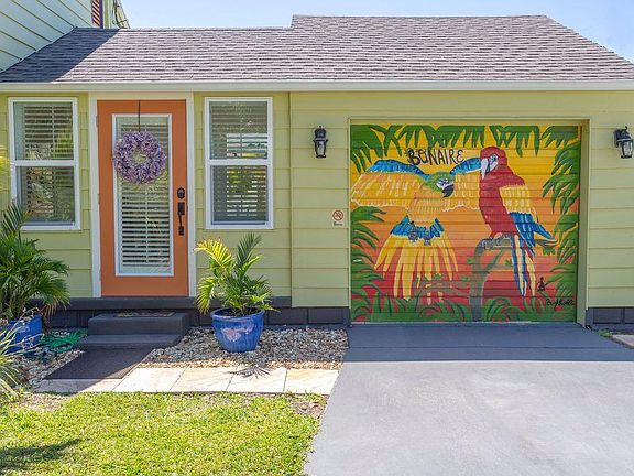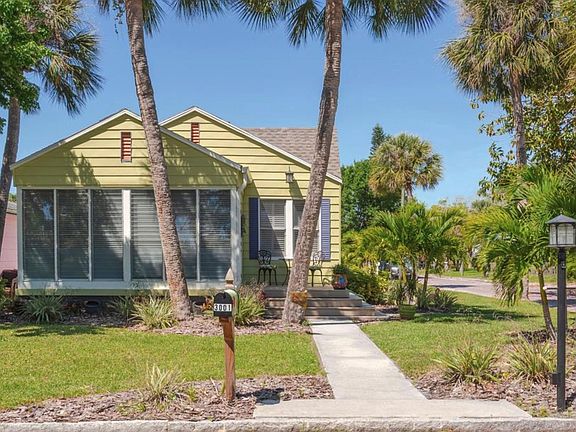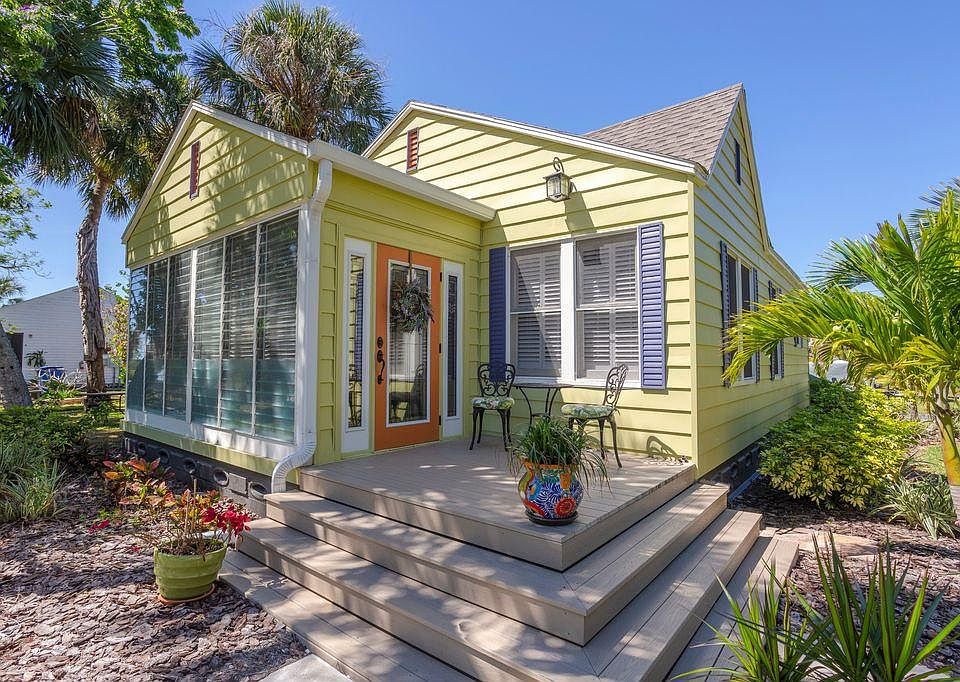 Our 1939 Bonaire Bahamian Bungalow has been totally updated in the Art Deco style of the 1930s. It is located on a corner at the juncture of two brick paved streets with a lovely front and backyard. One block to the village for dining & shopping, and two blocks to the beach. Completely updated. Brand new floors and baseboards throughout the entire house. Brand new energy efficient windows. Featuring two good-sized bedrooms with lots of light, one bath with tub/shower, large kitchen, Olde Florida screened porch with jalousie windows, enclosed breezeway off kitchen, opening to private outdoor deck, and paved drive for your car. Complete updates of bath include: all new subway tile surround, new tub & fixtures, new HE toilet & vintage-style pedestal sink. Large glass block window over tub, lighted magnifying makeup mirror, retro sconce lighting, and marble tile floor. Kitchen update includes: Brand new LG stainless steel French door fridge, flat-top electric range & micro, dishwasher, Large single sink with all new white beadboard cabinets, quartz countertops. Breezeway off kitchen accessible from North entrance of house. Deck includes table for 6 with umbrella & BBQ grill, privacy fencing & large palms and an OUTDOOR SHOWER! Olde Florida screened porch has a ceiling fan to bring in cool breezes. The perfect place for the kids or the adults to hang out or even sleep. There is a small deck off the front porch. The entire house, including front porch and breezeway, are centrally air conditioned & heated. 2 Bedrooms with closets with ceiling fans and plantation shutters on the windows. Kitchen and living room have plantation shutters for that Bahamian feel as well. Laundry is located in the garage with new LG washer & dryer, and laundry tub. Garage floor has been finished with gleaming epoxy paint.