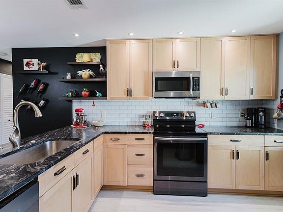 Welcome to Arbor Grove Condominiums, a hidden gem nestled amid lush landscaping and majestic Live Oak trees in the heart of St. Petersburg! This meticulously renovated 2-bedroom, 2-bathroom top-floor condo, offers 910 sq. ft. of beautifully designed living space with a serene screened and vinyl-windowed balcony overlooking the community’s park-like setting. The peaceful views, combined with tasteful, high-end updates throughout, make this home truly move-in ready and one of the finest offerings in the community. Step inside to find a custom-renovated interior that blends quality craftsmanship with modern style. The kitchen has been completely reimagined with solid birch wood cabinetry, leathered granite countertops, and sleek black stainless steel Samsung appliances. Ample cabinetry and thoughtful layout design make this kitchen both beautiful and functional. The open-concept floor plan connects the kitchen seamlessly to the dining and living areas, creating an ideal space for entertaining or relaxing. Throughout the home, luxury vinyl plank flooring provides a cohesive, modern flow, complemented by designer paint colors and custom LED lighting for a contemporary feel. The primary suite is a retreat of its own—featuring a walk-in closet and an expanded spa-style bathroom with striking penny tile flooring, a frameless European-style shower screen, and a stylish sliding barn door for privacy and flair. The guest bathroom mirrors the same level of custom renovation, with a full tiled shower and elegant finishes that echo the home’s overall sophistication. Every detail has been carefully curated for comfort and efficiency, including impact-rated windows, modern ceiling fans in all rooms, and a front-loading washer and dryer conveniently located inside the unit. You’ll have your assigned parking space right outside, with additional guest parking available nearby for convenience. Arbor Grove Condominiums is a secure, gated community offering resort-style amenities. Residents enjoy two pools, a fitness center, a clubhouse, and beautifully maintained grounds that create a sense of calm and connection with nature. Located just minutes from Downtown St. Petersburg, the Gulf beaches, I-275, and the Skyway Bridge, this location provides effortless access to shopping, dining, arts, and recreation. Whether you’re looking for a full-time residence, a seasonal escape, or a smart investment, this stylish, move-in-ready condo at Arbor Grove checks every box. Schedule your private showing today and experience the perfect combination of modern comfort, natural beauty, and convenient St. Pete living!