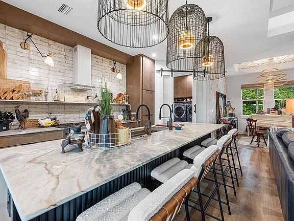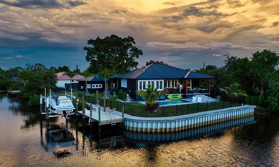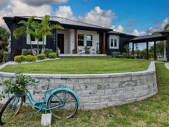 A One-of-a-Kind Masterpiece on the Water! Welcome to 3001 Banyan Way, Punta Gorda, completed in 2024, where architectural artistry meets uncompromising luxury. Set on a prime waterfront lot with intersecting canal views, 211 feet of seawall, and remarkable sunsets, this bespoke residence was crafted with every imaginable upgrade to create a true designer dream home. Simply stunning! From the moment you arrive, the curb appeal is undeniable— ultra modern and powerful exterior colors inspire the senses. A visual delight are the many exterior accents including Hardi Trim Board and Batten cement siding, an expansive lighted retaining wall, offset garage and connecting breezeway with smart wood beam pillars. Professional landscaping with designer lighting, an interlocking three-piece paver driveway and an iron fence with three locking gates frame the back of the property all the way to the seawall. Step onto the Chicago replica brick front porch, beneath a tongue-and-groove ceiling with recessed lighting, and through an impressive iron entry door. Inside, every room tells a story of craftsmanship and indulgence. The living room stuns with Venetian plaster tray ceilings, dramatic beams, a 100-inch linear fireplace, and a full quartzite feature wall. The gourmet kitchen is a showpiece: Dolomite Blue quartzite countertops throughout, GE Café matte white appliances including a six-burner propane range, two under-counter refrigerators, and full-height subway tile with a quartzite shelf. A walk-in pantry and adjoining laundry doubles as a bar and prep space, featuring cobalt blue GE smart appliances, built-in storage, a liquor drawer, and a chandelier-lit window seat. The master suite is a sanctuary with Venetian plaster finishes, custom ceiling design, and a spa-like bath offering a freestanding tub under chandelier light, a walk-through shower with body jets, double marble sinks, and artistic feature walls. Additional rooms showcase true individuality, including a music room adorned with gold-leaf stucco, a bespoke feature wall, and a dramatic chandelier. Outdoor living reaches resort level. A saltwater, heated PebbleTec pool with LED lighting is surrounded by an expansive paved entertainment deck. The covered rear porch features tongue-and-groove ceilings, an outdoor kitchen with grill and sink, recessed lighting, ceiling fans, and dual French iron doors that invite seamless indoor/outdoor living. At the water’s edge, the composite dock is built for the serious boater, with shore power, a 12,000-lb lift, and oversized pilings ready for a roof structure. Enjoy a 15 minute boat ride along the Venice Waterway to Alligator Creek, then to Charlotte Harbor and the Gulf beyond. Every detail is deliberate: spray foam insulation throughout, tankless water heater, hurricane-impact doors and windows, remote custom blinds, lighting integrated into the eaves and landscaping, the highest grade luxury vinyl plank and soap stone tile flooring, and a full-home generator with hook-up. The oversized 24’x24’ insulated garage is a marvel in itself, with epoxy floors, mini-split A/C, EV plug, storage system, and large windows framing canal views. This residence is more than a home—it’s a statement of taste, design, and lifestyle. Perfectly blending Old World materials with cutting-edge systems, 3001 Banyan Way is truly one of a kind Gem. Minutes from all that Punta Gorda has to offer, Fisherman’s Village, Harbor Walk, the Punta Gorda Yacht Club, and so much more!