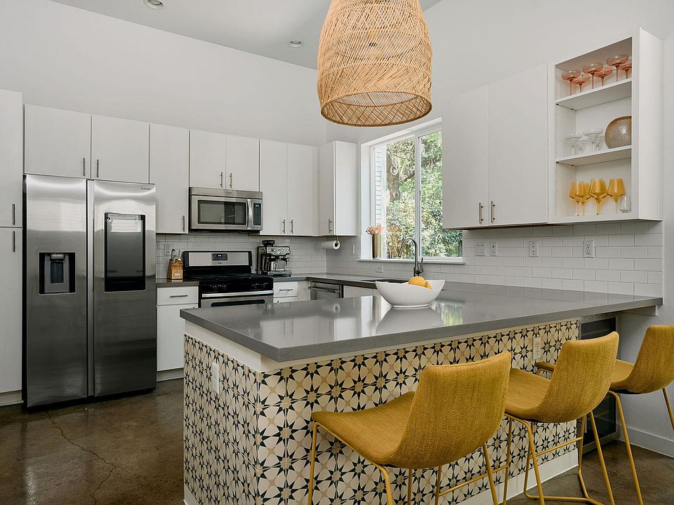 Nestled among the trees in Central Austin, this two-story home in the 04 offers the perfect balance of modern style and cozy living. Soaring ceilings, Velux skylights, and expansive picture windows create a canvas for natural light, warming the rooms and offering glimpses of the surrounding tree canopy. Thoughtfully curated spaces feature colorful wallpaper, unique hardware, and custom lighting, giving each room its own distinct character while blending seamlessly. The main floor boasts an open layout, with generous windows overlooking your spacious deck and the newly installed lush artificial turf – visible from both the kitchen and living room. Natural light truly pours into the living room from two large skylights, illuminating the space. The kitchen, just steps away, features a stylish concrete tile peninsula and ample room for cooking or entertaining. A completely redesigned half bath on this floor showcases stunning wallpaper and a vanity that is both beautiful and functional. Ascending to the second floor, you'll discover the inviting primary bedroom. This serene sanctuary features an en suite bathroom, high vaulted ceilings, and enchanting treehouse views, creating a quiet retreat. Also on the second floor are two additional spacious bedrooms, a clever nook perfect for a desk, a laundry room with gorgeous wallpaper and expansive shelving, and a second full bathroom. Stepping onto your back porch, you'll find an extended deck, ideal for sipping your morning coffee while you listen to the birds or entertaining guests under the stars. The deck leads to a beautiful, no-maintenance backyard featuring artificial grass and a convenient built-in area for a fire pit. This home is zoned for the highly sought-after Zilker Elementary and is only steps away from Tom Lasseter Park or South Austin favorites like Loro, San Gines, Kiindi, Bird Bird Biscuit, Radio, Vera Cruz, and Matt's El Rancho. All values are approximate and to be verified.