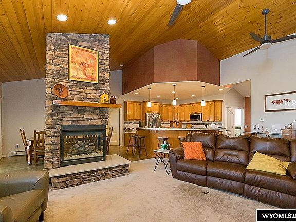 Custom ranch built by Haden Construction with a fully finished basement and thoughtful design throughout. The open floor plan showcases vaulted wood-plank ceilings and a striking three-sided fireplace in the main family and dining area. Enjoy rare privacy with no back neighbors! The kitchen is a true showpiece, featuring a large center island with sink, beautiful hickory cabinetry, quartz countertops, built-in office station, pantry, and appliance garage. You’ll love the breakfast bar and eat-in nook, along with a formal dining room complete with custom hickory built-ins. The split floor plan places the primary suite apart from two spacious upstairs bedrooms and office space with a full bath with double sinks. The primary suite boasts a coffered ceiling, walk-in closet, and a luxurious bathroom with a jetted soaking tub and tiled shower with glass door. Downstairs, the basement is designed for entertaining with a second kitchen that includes a large granite island, full refrigerator, and dishwasher. The open family room features wood flooring and a custom-built entertainment center. A built-in Fort Knox safe door provides access to a secure vault under the porch. Outdoors, the property is fully landscaped and very private with mature trees, an auto sprinkler system, custom curbing, upgraded Trex-style fencing, and a two-tier deck shaded by a natural tree canopy. A storage shed is included, and RV parking comes complete with a double metal gate and 50-amp service. Just off the heated three-car garage, you’ll find a mudroom, laundry room with utility sink and cabinetry, and a convenient half bath. Washer and dryer are included, and the entire home has been updated with modern black light fixtures. Situated in a desirable neighborhood near new schools, the Rock Springs Family Rec Center, and shopping, this one-of-a-kind home has every detail covered and is truly a must-see. Call listing agent Jannel Fossen with AAA Properties, LLC at (307) 389-0903 for more information or to schedule a showing.