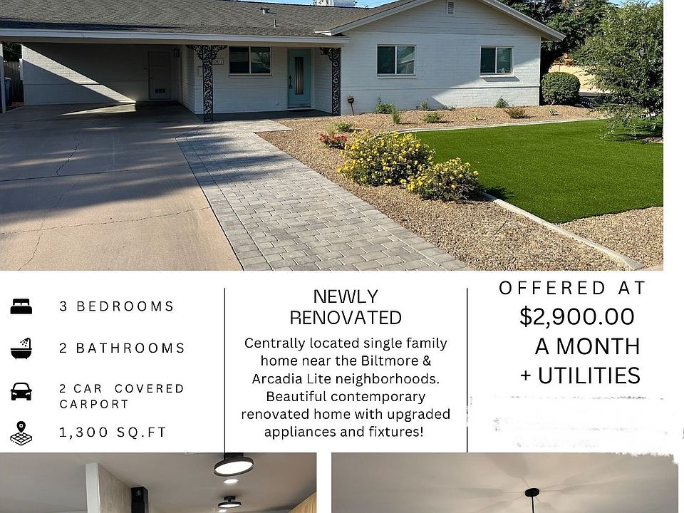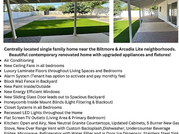 Centrally located single family home near the Biltmore & Arcadia Lite neighborhoods. Close to great restaurants and shops! Easy Access to the 202 or the 51 Freeways. Beautiful contemporary renovated home with upgraded appliances and fixtures! Air Conditioning New Ceiling Fans in all bedrooms Luxury Laminate Floors throughout Living Spaces and Bedrooms Alarm System (Tenant has option to activate and pay monthly fee) Block Wall Fence in Backyard New Paint Inside/Outside New Energy Efficient Windows New Sliding Glass Door leads out to Spacious Backyard Honeycomb Inside Mount Blinds (Light Filtering & Blackout) Closet Systems in all Bedrooms Recessed LED Lights throughout the Home Flat Screen TV Outlets (Living Area & Primary Bedroom) Kitchen: Open and Airy, New Neutral Granite Countertops, Updated Cabinets, 5 Burner New Gas Stove, New Over Range Vent with Custom Backsplash,Dishwasher, Undercounter Beverage Fridge, Microwave, Refrigerator with Water Filter and In Door Ice Dispensor, Stainless Steel Sink with Garbage Disposal. Bathroom 1: Soaking Tub with Glass Enclosure, New Vanity, Tiles and Fixtures. Bathroom 2: Shower with Glass Enclosure, Updated Tile, New Vanity Laundry in Storage: Washer and Dryer with storage 2 Car Covered Carport with large Driveway Electronic Keypad Lock for access from Carport New Electrical Panel New Insulation throughout Home Landscaping: Large and Welcoming Yard with Updated Landscaping with Mature Trees with Drip System, Synthetic Lawn in Front and Back, Pavers for Outdoor Entertaining. Owner will pay for monthly lawn care, Renter responsible for gas, electric & water. No smoking, No pets- open to negotiation with an additional pet deposit, Last months rent due at signing. Lease duration is for 12 months.
