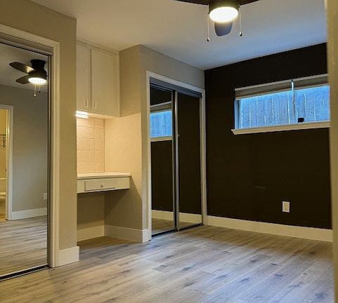 Private patio slabFreshly painted interiorBuilt-in deskBuilt-in microwaveStainless steel appliancesCeiling fansSlow-close cabinets