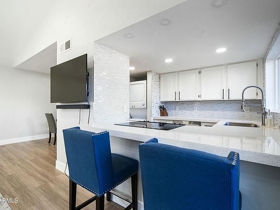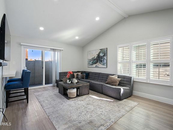 Discover this beautifully updated 2-bedroom, 1-bathroom end-unit townhouse in the desirable Arcadia Lite neighborhood! Filled with natural light, this home features vaulted ceilings, upgraded flooring throughout, and new dual-pane windows and sliding doors for added energy efficiency. The remodeled kitchen is a chef's dream, offering sleek stainless steel appliances, quartz countertops, a stylish tiled backsplash, and a convenient full-size stacked washer and dryer. The spacious master bedroom includes a walk-in closet with custom built-ins. The second bedroom features double closets and a sliding door to the backyard. Step outside to a private backyard with low-maintenance faux pet-grade grass and extended block walls for added privacy. Additional amenities include a two-car covered car port with extra storage space, plus access to a community pool for relaxation and fun. Don't miss the opportunity to make this stunning townhouse your new home!
