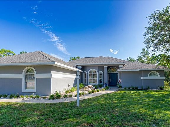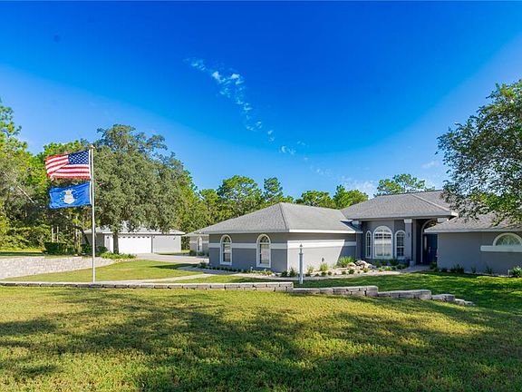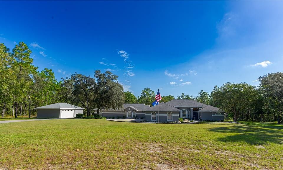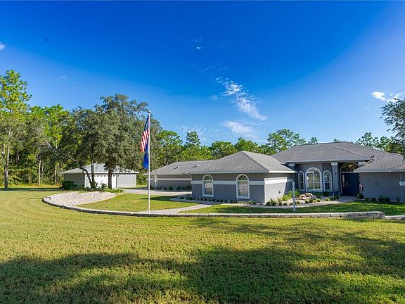 PINE RIDGE ESTATES – 2.75 Acres with Pool, Main Home and Guest/In-Law Suite, along with Multiple Garages! This property features a main home and a separate guest/in-law suite, each with its own electric service. The main home offers 3 bedrooms, 2 baths, split plan, updated chef’s kitchen with granite counters, cabinetry, appliances, and lighting (2024), propane fireplace, plantation shutters, laundry with stackable washer/dryer (2022), water heater (2023), HVAC filtration (2024), new entry door (2025), and a whole-house generator. The guest/in-law suite includes 1 bedroom, 1.5 baths, office/den with Murphy bed, quartz kitchen, dining room, great room with propane fireplace, updated primary bath with dual vanities and quartz, interior laundry, and private screened patio. Enjoy a large screened saltwater pool with waterfall (pump 2025), 3-car attached garage, and 3-car detached garage for storage, workshop, or recreational vehicles. Set on 2.75 acres with access to 26+ miles of community horse trails, this multi-functional home blends modern updates with outdoor living.