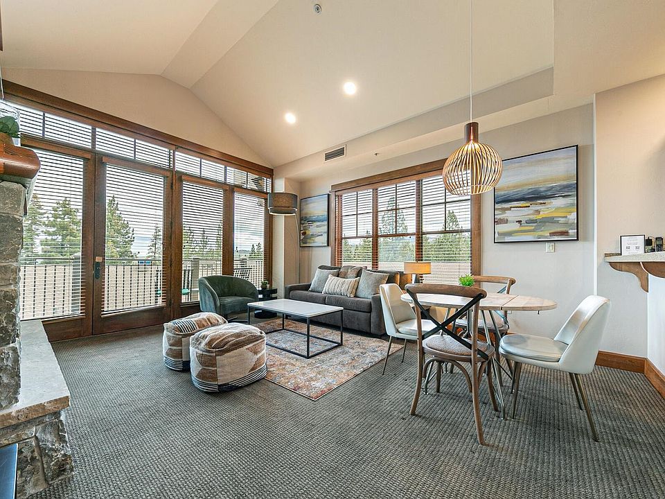 Welcome to this top-floor corner residence located within the Village at Northstar, offering convenient access to the lifts and slopes. This condo blends comfort, style, panoramic mountain views, and accessibility for year-round enjoyment. The beautifully designed one-bedroom, one-bathroom space features vaulted ceilings and an abundance of windows, a lot of natural light and easterly views of the Mt. Rose Carson Mountain Range. The inviting great room features a cozy stone fireplace, creating a warm and welcoming ambiance for après-ski relaxation. The condo comes fully furnished with all-new, high-quality pieces, including a luxurious Restoration Hardware king bed and a Stearns and Foster mattress, ensuring restful nights after your daily adventures. Modern LED recessed lighting enhances the elegance of the space, highlighting the contemporary finishes throughout. As an East West Hospitality Platinum Level residence, this condo is designed for increased rental revenue potential, making it a compelling investment for those eager to embrace the vibrant Northstar lifestyle. Convenience is key, with an underground heated garage parking spot, complete with a storage cage, ski locker lobby, and direct elevator access to your residence floor. Residents also enjoy access to a fitness center, rejuvenating spa, and heated pool, elevating the luxurious experience.