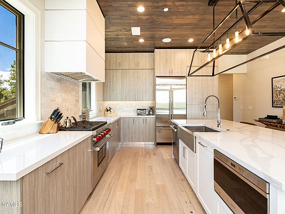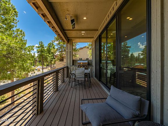 3001 S Tourmaline Dr 28 - Experience luxury mountain living in this gorgeous 3 bedroom, 3.5 bath furnished condo nestled within the prestigious guard-gated community of Pine Canyon in Flagstaff. This upper-level retreat boasts an open concept floor plan, seamlessly blending modern style and functionality. The gourmet kitchen features two tone custom cabinetry with massive center island, quartz countertops, a Sub-Zero side-by-side fridge/freezer, Wolf gas range, and a built-in microwave. The great room is designed for both comfort and elegance, showcasing a beautiful stone fireplace and a wall of sliding doors that open to a covered deck, perfect for enjoying indoor-outdoor living among the pines. The primary suite offers access to the deck and a spa-like bathroom complete with a large soaking tub, a walk-in shower, dual vanities, heated floors, and a walk-in closet. Each additional bedroom boasts an ensuite with designer-tiled showers, ensuring privacy and comfort for guests.(Enjoy the best of Flagstaff's luxury lifestyle in this contemporary mountain retreat!