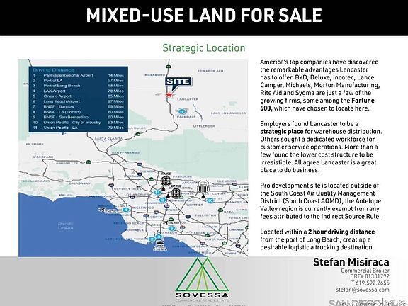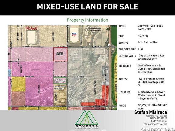 40 acres of prime mixed-use land at the signalized intersection of Avenue H and 30th Street in Lancaster. Zoned for Mixed-Use, allowing multi-family (15-30 units/acre, up to 430 units), business park, and light industrial, this site is ideal for investors or developers seeking to capitalize on the regions growth. With all utilities available in the street, off-site infrastructure on W Avenue H, and proximity to a freeway off-ramp, the property offers excellent visibility and access. Adjacent to the Antelope Valley Fairgrounds, currently undergoing a 90 Million expansion, the site is poised for success in a thriving market. Antelope Valleys aerospace hub, anchored by Northrop Grumman, Lockheed Martin, and NASA, employs over 20,000 well-paid professionals. Long-term contracts, including 80 Billion for B-21 bomber jets, AI and robotics programs, and the Supersonic X-Plane, drive economic growth. Increased activity at USAF Plant 42 creates immediate technical and assembly jobs, with over 2,500 new positions generating 6,000+ support jobs locally. Lockheed Martins new 208,000 SF high-tech manufacturing facility (2022) highlights the regions commitment to growth. With no new apartment construction in over 30 years, the Antelope Valleys affordability fuels a robust rental market, making this site a prime opportunity. Strategic Location: 40 acres across four parcels at a hard corner signalized intersection with excellent visibility, minutes from a freeway off-ramp. Flexible Zoning: Supports multi-family (up to 1,200 units), business park, or light industrial development. Development-Ready: Utilities in the street and off-site infrastructure on W Avenue H in place. Nearby Growth: Adjacent to the 90 Million Antelope Valley Fairgrounds expansion, with 4 Million SF of industrial space in plan check and seven residential communities under development nearby. High Demand: Severe housing shortage with strong rental demand driven by affordability and aerospace job growth. Economic Momentum: Aerospace-driven job creation and major investments position Lancaster for long-term growth.