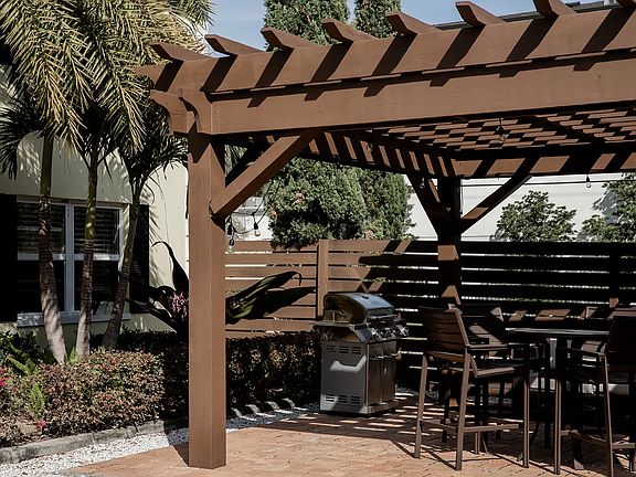 The pet-friendly property is meticulously landscaped with majestic palm trees, outdoor lounge and seating, BBQ grill, and fire pit.