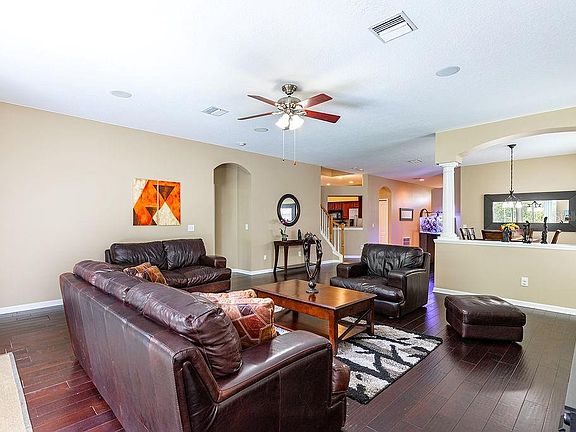 Fall in love with this charming residence located on a tranquil and peaceful cul-de-sac, with gorgeous conservation views in the Country Walk Village in Wesley Chapel. The wonderful club house offers lap pool, family pool, tennis courts, basketball, playground, and much more! Inviting curb appeal with manicured landscaping and welcoming entryway. This home offers 2,570 SF., 4 bedrooms, 2 baths and 2 car garage. Among some upgrades you will find modern lighting fixtures, exquisite hardwood floors in bedrooms, tile in high traffic areas, upgraded carpet upstairs, arched walkways, generous sunlight and lots of space for art display. Greet your guests in the foyer and welcome them to separate dining and living rooms. The gourmet kitchen is a chef's delight! It displays cherry cabinetry, modern black and stainless-steel appliances, smooth top range, pantry, and a convenient breakfast nook. Through oversized sliding doors access the backyard patio and enjoy gorgeous views of the woods, this outdoor space is expansive and can accommodate a pool. The master bedroom is generous in size, features tray ceilings and offers a large walk-in closet, master bath with dual vanities, jet tub and separate shower stall. The secondary bedrooms are beautifully appointed. Upstairs bonus room/bedroom with cathedral ceilings. Plenty of storage space throughout and separate laundry room. Very well maintained! Minutes to I-75 and regional malls. Publix, Target, Costco, Florida Hospital, and restaurants. Great place to call home and enjoy the Florida lifestyle!