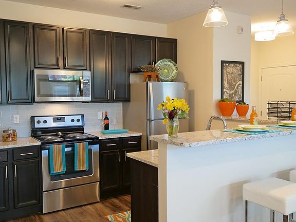 - Exterior features: 9' Ceilings, ADA Apartments Available, Apple Pay Available, Balcony, Covered Bike Shelter, Electric Car Charging Stations, Granite Counter Tops*, Large Windows, Linen Closets, Luxury Soaking Tub, On-Site Maintenance, On-Site Management, Outdoor Fire Pit, Pet Park, Stainless Steel Appliances, USB Outlets on all Kitchen Islands*, Under Cabinet Lighting*