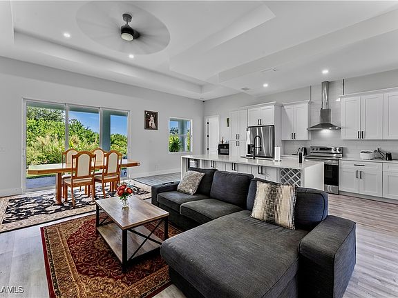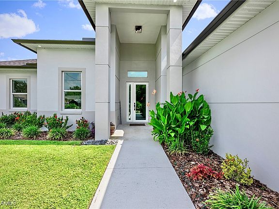Welcome home to this MAGNIFICENTLY (2022) BUILT 3/2 + Den that has been professionally landscaped with desirable POLISHED STONE around the entire perimeter & spotlights 8ft doors with multiple tray ceilings for a GRAND ELEVATION, gorgeous CALACATTA QUARTZ rainfall countertops with an awarding breakfast bar, and enticing LUXURY VINYL flooring throughout. This open floor plan highlights custom soft close shaker cabinets with dual pantries, glass French doors, IMPACT WINDOWS, premium STAINLESS STEEL appliances + wine cooler & rack, dual closets with built-in shelving in master, an appealing tiled backsplash with hood vent, spacious vanities, an impressively TILED walk-in shower, and an admirable privacy BARN DOOR in master bath. It also features a folding station & vanity tub in laundry, smooth surface drywall, rainfall shower-heads & premium fixtures, recessed lighting, an irrigation system plus fruit trees, overhead garage storage, whole house gutters with drainage system, security cameras, and an ENORMOUS back patio great for entertaining. This peaceful property is nestled away on a quiet street located just minutes from Fort Myers all major amenities. Schedule your showing today!