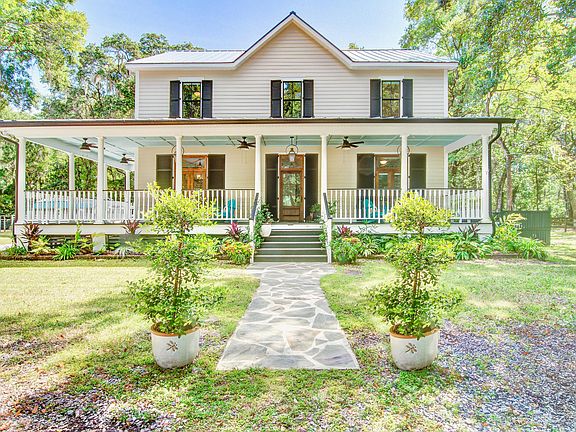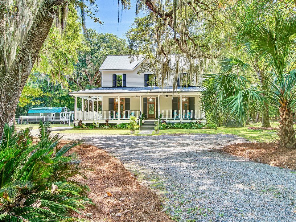 Sprawling coastal retreat on nearly 5 private acres with ADU and workshop! This elegant estate is tucked behind a lush layer of grand oaks and native palmettos just minutes from the beaches of Kiawah Island and the world class shopping and dining of historic Downtown Charleston! The wide and welcoming front porch will graciously welcome you home each day and will be your chosen venue for coffee in the mornings and sunsets in the evenings. Though built in the modern era, you may second guess that when you see the high ceilings, solid wood french doors and reclaimed wide plank heart pine floors, typically found in historic homes. Modern upgrades like stainless steel appliances, en suite baths for every bedroom, frameless glass shower enclosures,designer lighting and plumbing fixtures and composite decking harmonize with traditional details providing functionality and sophistication. With over 3000 square feet on 3 levels, the spacious main house features a bedroom and full bath on the main level accompanied by a large dining area open to the living room, anchored by a large stately fireplace and handsome floor to ceiling built-ins. In between the dining and living areas is the bright farmhouse style kitchen with rustic brick flooring, open shelving, bright white pantry cabinets with rollout drawers, stainless steel appliances, butcher block counters and gourmet gas range with stainless hood and tile backsplash. The cozy lounge is tucked away in the back of the home and features slate floors, elegant built-in bookshelves and a cozy fireplace. With double doors that lead to the back deck and a mount for the tv already over the mantle, this will quickly become everyone's favorite gathering space. Before heading upstairs, stop into the downstairs guest suite just off the foyer with private access to the front porch and a large handicap accessible bathroom with zero entry tiled shower. Ascend the wide staircase to the second level to find the large primary suite with the home's third fireplace and a large ensuite bath with dual vanity, huge frameless glass marble shower and a bright adjacent space just waiting to become the closet of your dreams! A whimsical clawfoot tub offers views of the grounds and yet another place to relax and enjoy the grounds. Two more bedrooms occupy the second floor along with the home's laundry room and access to a second story covered porch. The third flood is home to a large bonus room, perfect for a kid's playroom, media room, home office or 5th bedroom. A large walk in attic completes this level and provides easily accessible storage space. The ADU (accessory dwelling unit) is separate from the main house and is equipped with a full bathroom, kitchenette, mini split, stacked washer/dryer and a huge porch with composite decking. A second driveway provides dedicated access for the ADU, currently rented month to month. The third structure next to the ADU is connected to power and water/septic and could be a workshop or conditioned storage. Lastly, just beyond the flower and vegetable garden is an RV hookup should you need additional space for visiting guests! With almost 5 acres of privacy and gorgeous southern vistas, this personal sanctuary will whisk you away from the world the moment you arrive and nearby beaches, shopping and dining are just minutes away!