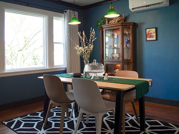 Bright 1910 home with many updates. Dining, living, kitchen, bedroom, laundry, and full bath on main floor. Two bedrooms, an office, and a half bath on upper. Metal roof, cedar shake siding, wood, laminate, and tile flooring. Newish water heater, and one-year-old downstairs windows. The property is zoned both residential and commercial, so there may be a business use for the somewhat decrepit but massive garage with electricity and plumbing at the rear of the property.
