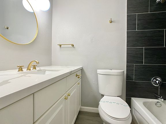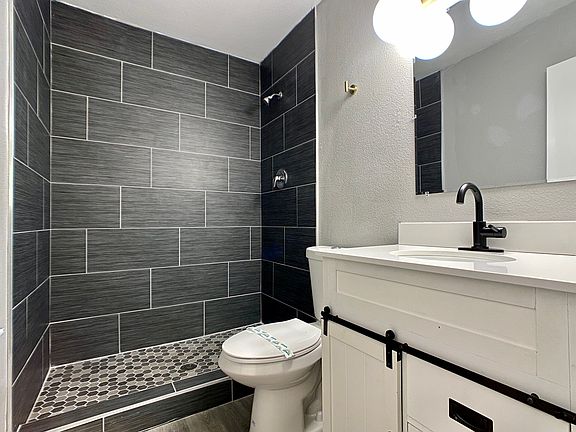 Stylish lighting fixturesCovered parking spotPrivate backyard patioWalk-in closetsCarrera marble countertopsVinyl plank floorsRemodeled tiled bathroom