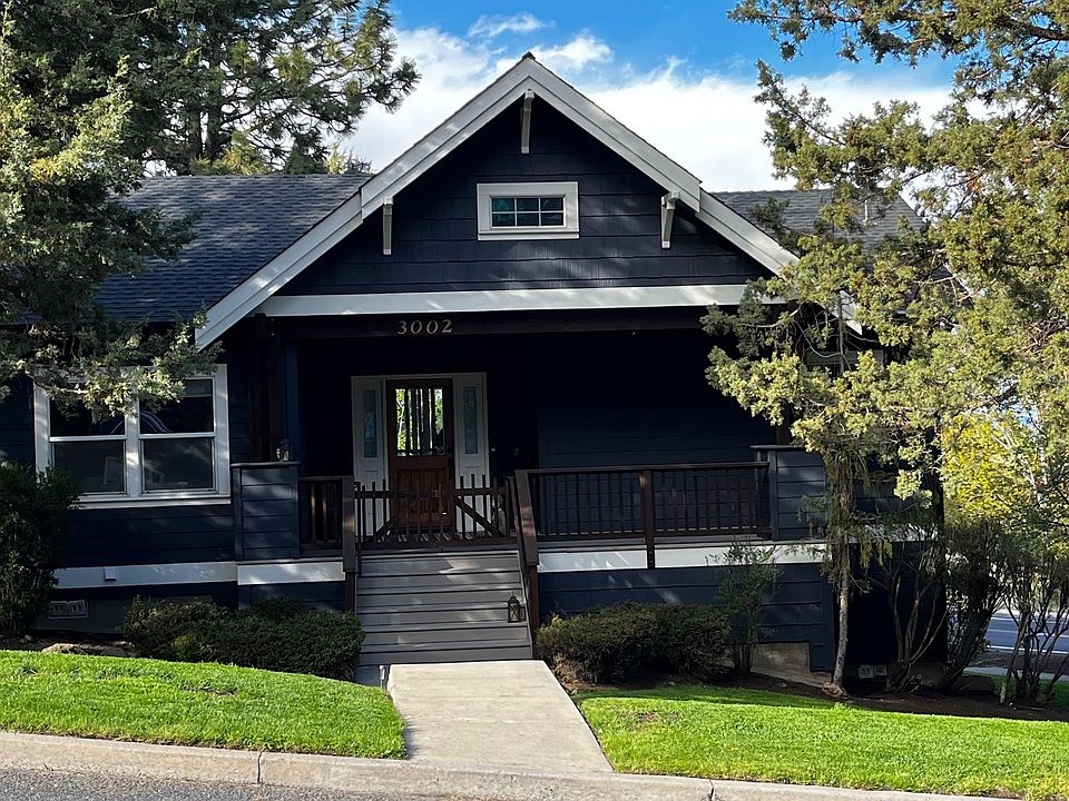 Beautifully updated Awbrey Village craftsman style home w/ mountain & city views. This 3 bedrooms, 2.5 bathrooms + office home offers an open great room with vaulted ceilings and gas fireplace plus built-ins and views. Remodeled kitchen with custom cabinets and new quartz counter tops, stainless steel appliances and chef's range, large pantry and breakfast bar is the heart of the home. The deck off the living room with views is perfect for BBQing. Large primary suite on main level with huge, renovated bathroom, soaking garden tub plus tile walk in shower, heated floors and more. 2 guest rooms plus large bath with double vanity on lower level. Low-maintenance, fenced and irrigated back yard with sod, flagstone patio, gas fire pit and fenced off area for a garden. 2 car garage. Corner lot. Large trees. Lots of privacy. Landscaping included. Pets welcome with references and pet deposit. Additional pet deposit, $500 per pet.