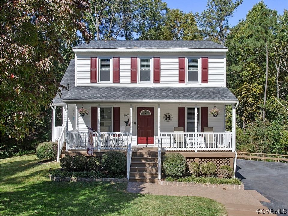 Your next home is nestled in a cozy cul de sac with awesome neighbors and treetop privacy in back. Loved and meticulously maintained by its current owners for two decades, this traditional Colonial enjoys a half acre lot and a woodsy backdrop that includes a small creek. The driveway is freshly paved and the yard is beautifully established and includes irrigation. The front porch is perfect for rocking chairs as you unwind from your day. Inside, fresh paint & new LVP flooring greets you on the main floor that has fantastic flow. A large family room with beautiful light leads to the eat-in kitchen that includes quartz countertops and a spacious pantry. The kitchen sports a handy side porch entrance as well as access to the large rear deck that's ready and waiting for your next bbq. A large laundry room has fantastic storage and cabinetry and is located in the hallway that also includes an updated half bath. The upstairs is carpeted and offers three bedrooms, including a primary suite with an en suite bath with a large walk-in closet. A hall bath and pull down attic completes the top floor. The walk out basement is carpeted and currently used as an office and "man cave" but could easily work as a 4th bedroom & even has the possibilities of an en suite since it's roughed-in with a water line and exhaust fan (roughed in bath is in the unfinished part of the basement). With a private driveway entrance with newer French doors, the basement offers fabulous in-law suite or private teen suite opportunities. A detached shed was added in 2020 & makes for a great workshop or extra storage. Interior to the neighborhood and peaceful and quiet, this home is ready for its next family to love it. Added bonuses include quick access to major highways, highly rated Chesterfield schools, convenient to shopping, restaurants, parks & more. Roof, HVAC, Gutters, Windows & Doors, Paint, Flooring, Quartz counters & backsplash are all recently upgraded; dates Supplements. SEE ONLINE VIDEO TOUR.