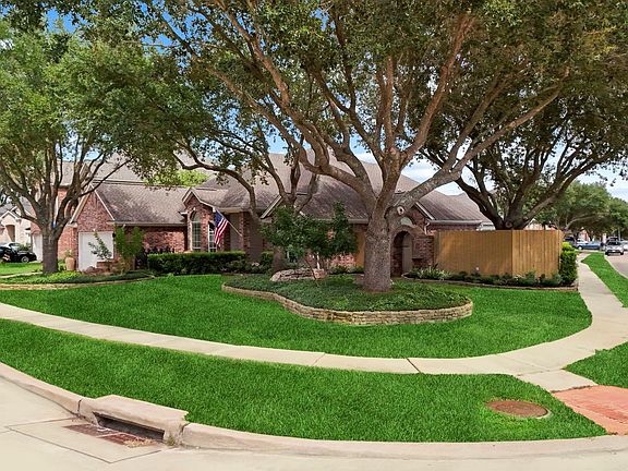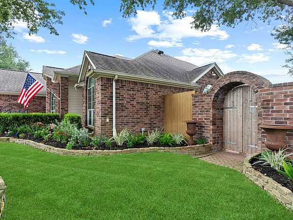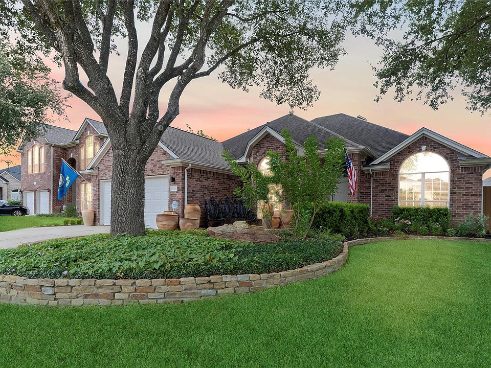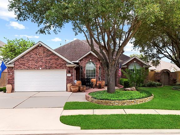 Welcome to this stunning original-owner one-story home, move-in ready! Nestled on a beautifully landscaped corner cul-de-sac lot, sprinkler system & all-brick Energy Star rated home features a dramatic entry with soaring coffered ceilings, crown molding, custom paint, upgraded fixtures & travertine stone floors. Formal living & dining lead to a spacious family room with tall ceilings, wall of windows & custom fireplace, open to the gourmet kitchen with granite counters, large island, soft-close cabinets, tile backsplash, stainless appliances, breakfast bar & walk-in pantry. The private primary suite boasts high ceilings, a sitting area, French doors to a spa bath with dual vanities with make-up area, deep whirlpool tub, shower & massive walk-in closet. Two guest bedrooms & full bath complete the interior. Bonus features: man’s garage, Texas basement in attic, storage shed, outdoor kitchen with fireplace, and no flooding during any storms! Low tax rate! Walking distance to pool & more!