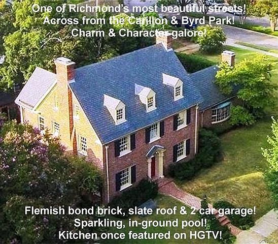 Location, Location, Location! A rare opportunity to own an outstanding Flemish bond all brick Colonial Revival home with slate roof, detached 2 car garage and sparkling pool in a storybook setting. Across from the iconic Richmond landmark, the Carillon, this home has charm & character galore. Maintained with TLC by the current owners (also the owners of Martha's Mixture Antiques formerly located in Carytown!), this home is gracious & elegant yet family friendly. Perfect size for entertaining large or small. Plenty of possibilities for expansion if desired. Kitchen was once featured on HGTV! Priced knowing some updates may be desired - or maybe not. For history buffs, the house was designed by Henry Carl Messersmicht who also designed Cary Court & many downtown buildings. 2 Non-Profit corporations were born under this roof. You will fall in love with this house!
