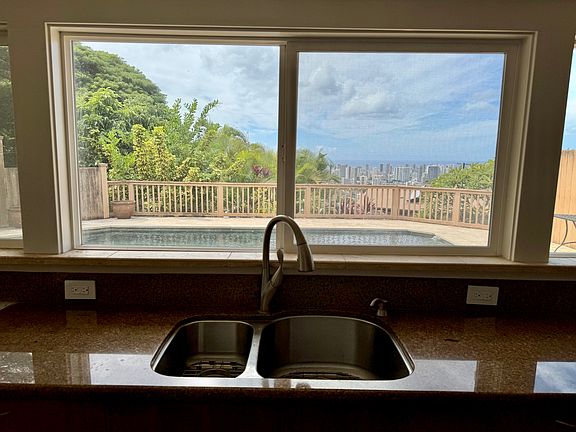 Private one bedroom, one bath on St Louis Heights. Enjoy stunning city, ocean, and sunset views from your expansive kitchen windows and built-in dining nook. Escape the heat of the city with travertine floors, built-in split AC unit inside, and cool mountain breezes over a swimming pool outside. This unit was just upgraded with a fully renovated bathroom, new bedroom flooring, and all new appliances including a refrigerator, all-in-one laundry machine, and a new range. Shared pool on the property! A perfect retreat for a young professional or couple.