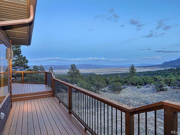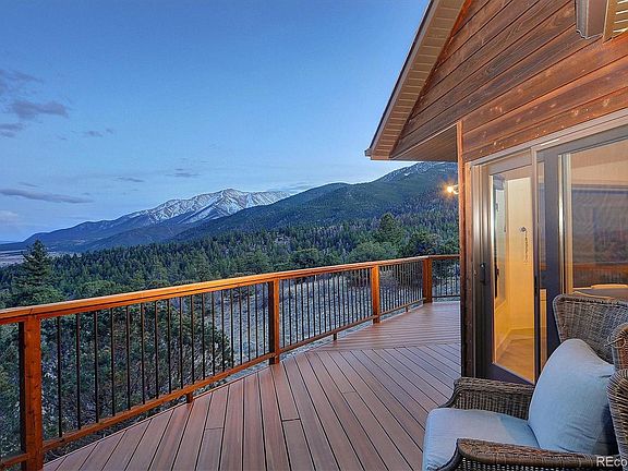 Nestled amidst the Colorado Rockies and surrounded by forests, this exceptional home offers a tranquil mountain retreat with stunning panoramic views. The southern exposure provides illustrious vistas through the expansive picture windows, appealing to outdoor enthusiasts as well as those seeking a serene setting. The open living room features a modern gas fireplace, gorgeous walnut flooring, and a strategic vantage point across Chaffee County. The kitchen is intentionally designed for entertaining, featuring striking granite countertops, custom wood cabinets, upgraded appliances, and eye-catching tile work, complemented by an ideal island for seating, food prep, and storage. Indoor and outdoor dining areas are enveloped in spectacular scenery, perfect for hosting while creating memories in one of the most breathtaking locations in the mountains. The sliding patio doors lead to a wrap-around deck, ideal for enjoying a coffee, a glass of wine, or a good book while appreciating the natural surroundings. The main floor primary bedroom provides a relaxing retreat after a long day, complete with a custom-designed closet system and a beautiful ensuite featuring a separate soaking tub and steam shower. Additional amenities on the main floor include a convenient powder bath, an attached and heated two-car garage, and access to the basement level. The lower level is equally suited for gatherings, offering an inviting family room with a wet bar, an office with a private exterior entry and electric fireplace, two bedrooms, a full bathroom, a 3/4 bathroom, a laundry room, and a cozy corner library. The covered patio includes a hot tub and ample space for relaxation after a day on the trails. Asphalt driveway, 3.13 acres of gorgeous nature in the desirable Game Trail subdivision, just a short drive to the sweet mountain town of Buena Vista. This property represents a unique opportunity to realize an exciting and active mountain lifestyle with the luxurious amenities of home.
