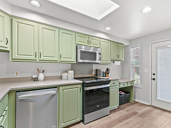 Experience stylish, comfortable living in this impeccably maintained 3-bedroom, 2-bath home. Situated on an oversized corner lot, this single-level residence offers a blend of classic charm & modern updates. The living room welcomes you with a soaring vaulted ceiling & a bay window, while new vinyl plank flooring & contemporary lighting enhance the entire space. The kitchen is a chef's delight, equipped w/durable Corian countertops & stainless steel appliances, & opens up to the main living area, making it ideal for gatherings.