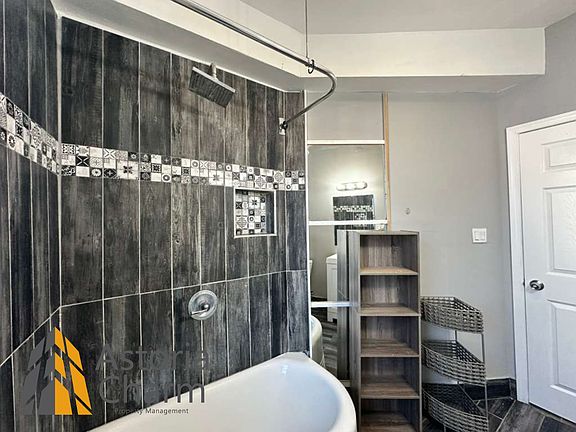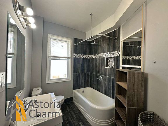 This second floor apartment offers 2 bedrooms and 1 full bathroom with a bathtub and rainfall shower head. The home features a mix of tile and hardwood floors, along with an eat in kitchen and a separate living room for a comfortable layout.
