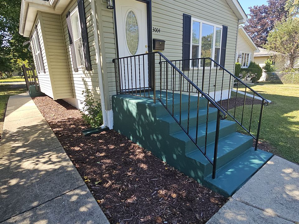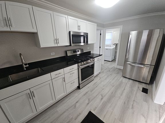 Beautiful Kitchen with new granite countertops & cabinets. High quality appliances including Samsung stainless steel range, new stainless steel microwave above range and beautiful stainless steel refrigerator. Washer & Dryer installed! All new floorings with soft carpet & high quality LVP flooring. All new Sherwinn Williams quality paint, including moldings, doors, ceilings & walls. Sharp modern paint colors! Bathroom new sliding doors, new toilet, pedestal sink, new led mirror, exhaust fan & medicine cabinet. New door hardware, closet shelving, blinds on all windows, new locks. Beautiful light fixtures. New smoke & carbon monoxide detectors. Awnings above exterior doors. Unfinished newly painted two tone basement. Quality gas furnace, gas hot water heater. Detached garage & rear parking.