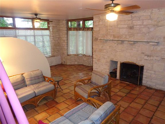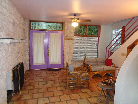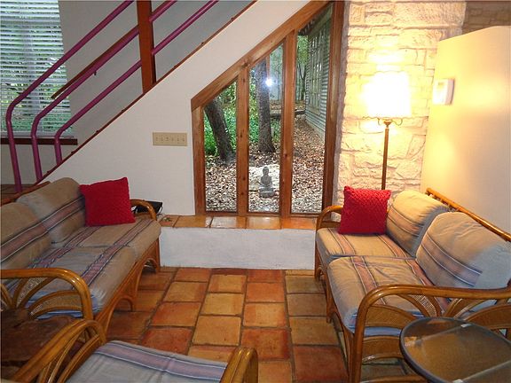 Texas Hill Country original - wooded lot. 2 bedroom 1 bath house with bonus room that could be an office/studio/bedroom. Large windows throughout giving tree house feel. Living room has a gas fireplace. Kitchen has updated appliances and tile counter tops. Door in dining area opens to outdoor patio. Bedrooms are on the 2nd floor, both with large closets. Bathroom is on the 2nd floor and has a clawfoot tub adapted with a shower. Utility room accessed through exterior door has storage and heater.