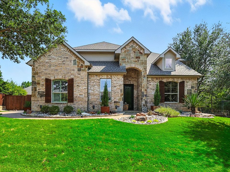 Step inside to discover refined architectural details throughout. Dual staircases—one split-front and one winding in the back—add character and functionality to the open, flowing layout. French doors open to an executive study, while upstairs you'll find a media room, a spacious loft game area, and custom homework stations with a Juliet balcony overlooking the grand entry and the inviting family room, complete with a striking stone fireplace.