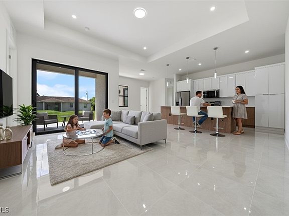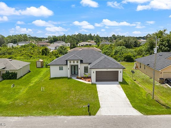 Brand new and completed in April 2025, this 3-bedroom + Den, 2.5-bath home in Lehigh Acres offers modern design and flexible living on a spacious 0.25-acre lot with an oversized backyard and full sprinkler system. The open floor plan features 10' ceilings throughout and stunning 11' coffered ceilings in the living and primary suites. The Den offers potential as a 4th bedroom. A chef-style kitchen shines with quartz countertops, stainless steel appliances, and a large island perfect for entertaining. The primary suite includes a walk-in shower, double vanity, and private water closet, while tile flooring extends throughout all bedrooms and baths. Enjoy a covered lanai, exterior-access half bath, hurricane-rated windows and doors, pre-wiring for security, and a 2-car garage. Located near Sunshine Blvd and SR 82 for easy access to shops, parks, and more—this home delivers style, space, and smart living. *Seller is open to offering a contribution toward buyer's closing costs, subject to terms of the contract and seller approval*