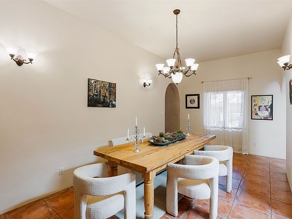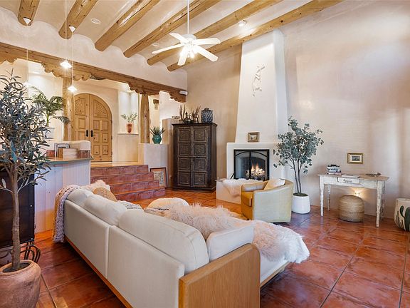 Step into the warmth and timeless charm of Santa Fe living in this inviting pueblo-style home, where generous spaces and authentic character immediately make you feel at ease. Smooth plaster walls, soaring ceilings with softly curved vigas, and clerestory windows fill the main living area with natural light, creating a space that feels both open and cozy. Evenings naturally gather around the wood-burning fireplace, while French doors invite the outdoors in—perfect for entertaining or quiet moments at home. A tucked-in wet bar adds an easy touch for hosting.