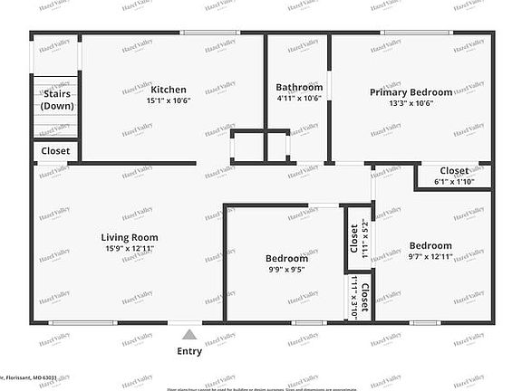 This 912 sq. ft. home in Florissant, MO includes 3 bedrooms and 1 bathroom with a layout that features a living area, kitchen, and basement. The front exterior has a brick facade, a covered entry, and a covered carport on the side of the home. The living area, hallway, and bedrooms feature plank-style flooring.
