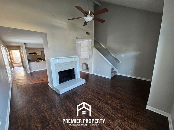 Step inside to a bright, open living room featuring high vaulted ceilings, built-in shelving, and a cozy brick fireplace with a mantel-perfect for relaxing evenings. The modern kitchen offers ample counter space and storage, flowing seamlessly into a welcoming dining area ideal for family meals or entertaining guests. A laundry room with washer and dryer hookups adds everyday convenience.