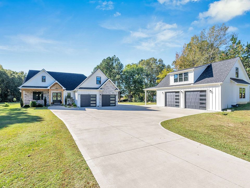 Stunning Craftsman-Style Home on 1.83 Acres-No HOA's or Deed Restrictions! Discover the perfect blend of comfort, craftsmanship, and convenience in this beautiful 3-bedroom, 3-bath home set on a spacious lot. Ideally located with easy access to major highways, and just minutes from shopping, dinning, and top-rated schools, this property offers peaceful living without sacrificing convenience. Step inside to a bright and open Great Room, featuring tall ceilings, large windows that fill the space with natural light, and built-in bookcases with cozy electrical fireplace. Durable SPC flooring flows seamlessly through the main living areas, creating a cohesive and modern feel. The gourmet kitchen is designed to impress, complete with stainless steel built in appliances, a large island with quartz countertops, tile backsplash, and designer vent hood. The dinning area, open to the kitchen, offers plenty of windows for a light and airy atmosphere-perfect for gathering and everyday meals. The owner's suite features a tray ceiling, double vanity, tiled shower, soaker tub, and a large walk-in closet with custom built-in shelving. The closet connects directly to a spacious laundry room with cabinetry, counter space and a mud sink for added convenience. Two additional bedrooms are located on the opposite side of the home, offering privacy and ample space. Upstairs, a finished Flex room over the garage includes a full bath and walk-in closet, ideal for guests a home office, or a private suite. Outside, enjoy the covered patio, long, driveway with extra parking, and a detached workshop with over 1,000 sqft of unfinished space-perfect for a studio, storage, or future expansion. With no HOA's you'll have the freedom to make this property your own. Don't miss this rare opportunity to own a beautifully designed home on a private, spacious lot in a prime location.