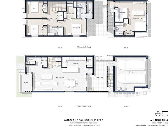 *Contact listing agent for information on all opportunities with Muskin Company including move-in ready options* This home is among the final phase of Muskin Company Row Homes in their nearly 20-years building high-end home in Mueller! Crafted by renowned local architecture firm Clayton Korte, w/ luxurious interiors from Slic Design, whose work has been featured in Architectural Digest & Vogue. This home offers a variety of flexible living options, with a 3-bedroom, 2.5-bath main house & full studio apartment w/ private entrance. This home is equipped w/ upscale touches including skylights, specialty concrete sink, terracotta tiles, artisan tile, plaster accent wall, solid wood cabinetry, energy-efficient metal roofs, and beautiful light fixtures handpicked to elevate the space. The open floor plan ushers you into an airy main room with stunning windows and modern lighting throughout the living and dining areas. The kitchen features a waterfall quartz countertop, Bosch appliances and custom wood cabinetry. A half bath & solid wood built-in, perfect for a desk or a bar, round out the main floor. Make your way to the second floor via a stairwell that’s framed by minimalist woodwork to find natural light pouring in through skylights. The primary suite enjoys large windows, custom built-ins in the closet, a floating vanity & an oversized frameless glass shower. Roomy secondary bedrooms flank the hall bath. The garage studio w/ private entrance sits at the back of the main house, beyond the patio. There’s ample room for living & sleeping, w/ a full bath, laundry hookups, & a petite but fully equipped kitchen. The space is perfect for an in-law unit, guest room, office, or short-term rental.