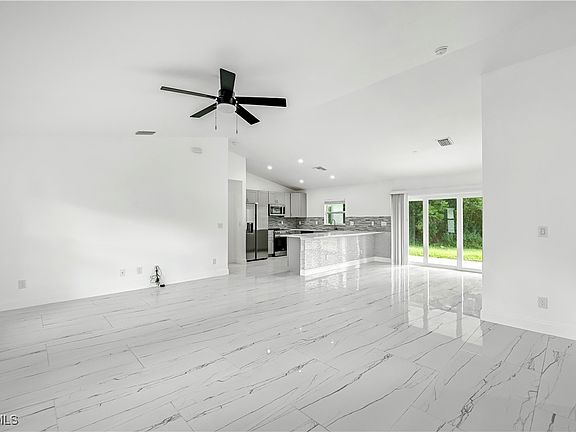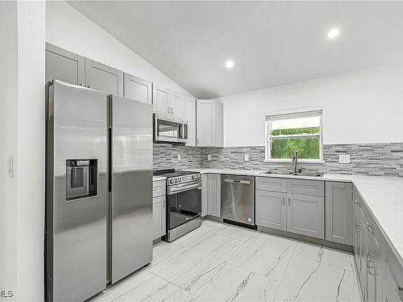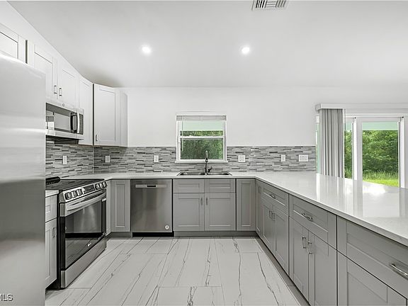 The kitchen is a chef’s delight, featuring stainless steel appliances, sleek gray cabinetry, and quartz countertops. The spacious master suite includes sliding glass doors to the lanai and a walk-in closet.