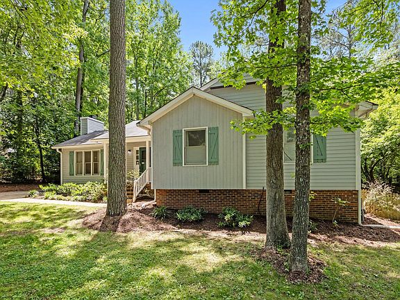 MULTIPLE OFFERS. Location, Location, Location! Minutes to RTP, RDU, Brier Creek and 540. Hard to find 3 bedroom ranch with covered rocking chair front porch in park like setting. No stairs to climb! Easy functional floor plan. Updated kitchen with white cabinets and stainless still appliances. Cozy family room with wood burning fire place. laminate and tile throughout, carpet in closets only. Gorgeous permitted sunroom. Encapsulated crawl space. See list of updates in docs. Ready to move into. All appliances convey. Large, flat, private, fenced back yard with storage shed & patio area. Neighborhood amenities include a pool, wooded trails, soccer and baseball fields, a playground, tennis and basketball courts, and lots of nature.
