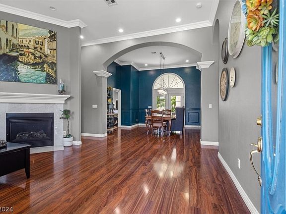 Exquisite ½ Acre Custom Home in Serene Country Estates, boasting top-rated schools and unparalleled charm. High ceilings adorned with rich crown molding and manmade wood flooring throughout create an inviting atmosphere. Elegant wood cabinetry, granite countertops, a breakfast bar, and a cozy breakfast nook, ideal for morning gatherings. Host memorable gatherings in the formal dining room, which opens through French doors to the expansive backyard oasis. Discover a huge covered patio, lemon trees, and lush greenery a perfect setting for outdoor entertaining. The private guest quarters offer versatility with a full bathroom and access to a rooftop sundeck boasting panoramic views of the Strip and mountains. Ideal for use as a game room, craft room, or additional entertaining space. Accommodate vehicles and outdoor gear effortlessly with a 4-car garage and dedicated RV parking, NO HOA enhancing practicality and convenience. Don’t miss the chance to make this one-of-a-kind property yours!