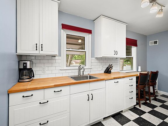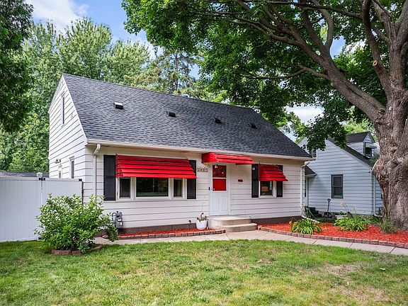 Welcome home to this rare four bedroom, two bath, one-and-a-half story home conveniently located in Robbinsdale with easy and immediate access to shopping & dining, great proximity to multiple parks, direct access to Theo Wirth and Veterans Memorial walking and biking paths, close to Theo Wirth Golf Course, and minutes from downtown Minneapolis! Curb appeal galore in this white home with black shutters, red awnings, and elegant landscaping. Hardwood floors greet you in the living room and throughout the main level and large windows allow for tons of natural light. Spacious galley kitchen features soft close drawers, butcher block counters, a subway tile backsplash, and all white appliances. Two large bedrooms and a full bath with a solid surface counter and tile shower surround round out the main level amenities. Upper level boasts a private primary bedroom with a good-sized closet and a 3/4 en suite bathroom with pedestal sink and both subway and mosaic tile shower surround. Two floor AC units supplement the home's central air and keep things cool on the upper level. The lower level features a cozy family room with pine panelling, custom built-in shelving, a built-in bar, an entertainment center area, and a bonus area that is great for exercise equipment. The laundry room and storage area complete the lower level experience. Walk out to the spacious, fully fenced backyard with tons of running room, a patio just off the kitchen, and plenty of room for a firepit and garden beds. The two car detached garage in great shape is such a luxury to have. Not many homes in the city look out the front to nature and a parkway instead of more homes, offering even more privacy. New windows and electrical panel make this home an absolute value play. Hurry home!