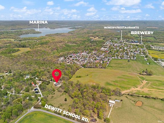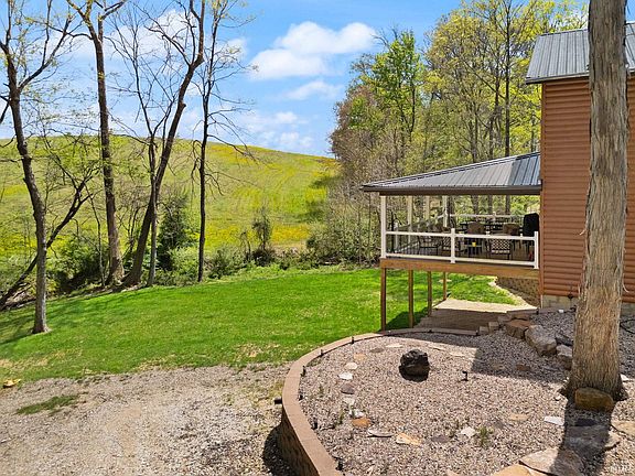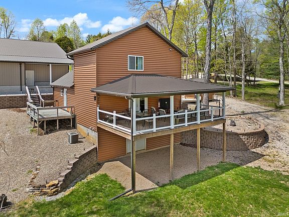 PATOKA LAKE Vacation is everyday at this Lake area location. Buy your very own special life time home already furnished !! All you need....refreshments and tooth brush !!! This home is a few minutes to restaurants and Marina or enjoy the kitchen and outdoor decks for cooking. Relax..... No wood log maintenance since this is vinyl log siding. Your private lane ends at this country location with generous parking areas outside. Detached garage 54 x 54, room for 6 cars, trucks or boats and Rv's. Open all 3 garage doors, invite guests and neighbors and let it Rip ! Entertain with so much room inside and out. Yes 1100 squ ft of open spaces from the kitchen, dining, several connected relaxing areas, loft and covered decks. The walkout basement entrance is under roof and open to the level yard and creek with Crawford County hillside views of the nearby farms. Enjoy yard games and hikes down the creek, cookouts and relaxing on outdoor decks on over 700 Sq Ft. of open sky and covered decks. Nice decks for outdoor living up and off the ground. Enjoy the breeze from the nearby forest and views of farm ground. One upper level, a loft now used as a sleeping space. Also on another upper level is the private owners bath, closet and bedroom for quiet space up and away. Live here, entertain here or get away and relax in private.